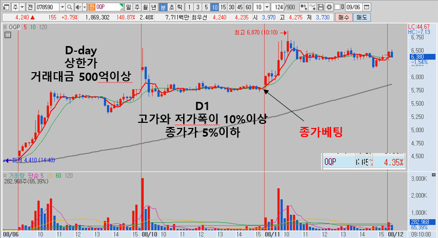 D1에서 D란 D-day입니다. 세력형님들이 돈을 써서 상한가를 만든 날을 뜻합니다. 결국 우리가 내일의 급등주를 찾기 위한 가장 첫번째 할일은 당일 상한가 간 종목들의 정리 입니다. 당일 거래대금이 500억 이상이고, 상한가를 간 종목들을 찾습니다. 그리고 상한가 다음날 계속해서 흐름을 지켜봅니다. 그리고, 상한가를 간 종목들 중에 D1(상한가 다음날)에 당일 저가대비 고가의 변동폭이 10%이상이었던 종목들을 찾습니다. 그리고 종가가 전일 종가 대비 5%이내에 끝나는 종목들을 찾아서 3시20분에 시장가로 매수주문을 나는 것입니다. 말로 설명하니까 굉장히 어렵게 느껴지실텐데 3줄 요약을 해보겠습니다.