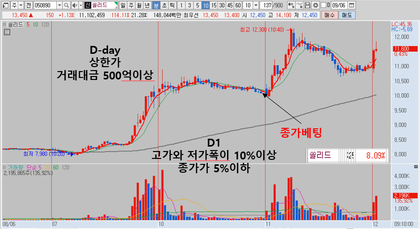 차트로 보시면 얼마나 간단한것인이 알 수 있습니다. 제가 실제로 거래했던 쏠리드라는 종목입니다.