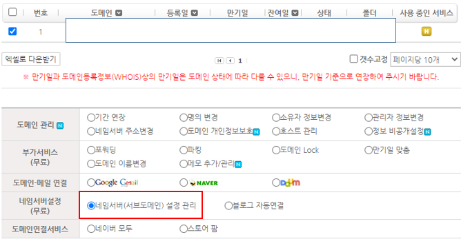 여기서 네임서버(서브도메인) 설정 관리에 들어가시면 아래와 같은 화면을 만나게 됩니다.