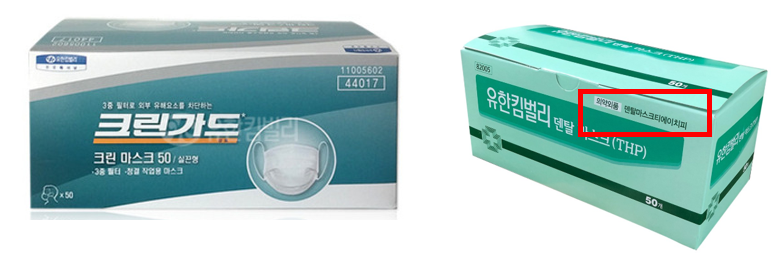 같은 유한킴벌리 제품이지만, 크린가드에는 문구가 없으나, 오른쪽 덴탈마스크에는 의약외품이라고 명기되어있다. 저런 문구가 적혀있지 않은 제품은 덴탈마스크를 가장한 그냥 일반 부직포 마스크이다. 부직포 마스크도 마스크를 안쓴거에 비해 감염예방 효과는 있다고 하니 사서 사용해도 무관하겠지만, 현재 사태를 빌미로 진짜 덴탈도 아닌 마스크를 덴탈이라 통칭하면서 가격을 비싸게 팔고 있는데, 이번 포스트로 잘 구분해서 현명하게 마스크를 구했으면 좋겠다. 크린가드 저 마스크 4만원은 정말 어이가 없다. 저 마스크 살바에 차라리 멜트블론필터가 안에 들어가 있는 3중구조 짝퉁 덴탈마스크가 오히려 감염예방에 도움이 되고, 돈 또한 절약할 수 있다고 생각한다.