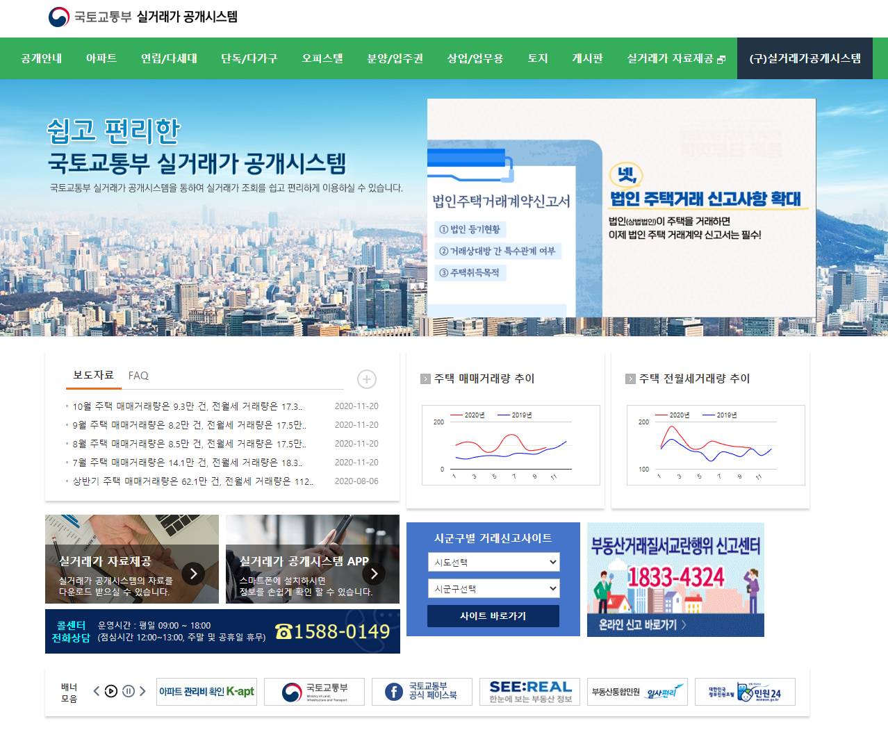 국토부 홈페이지를 이용하면 국토부 아파트 실거래가를 조회해 볼 수 있습니다. 정부에서는 부동산 거래의 투명성을 보장하기 위해서, 실제로 부동산이 거래되면 국가에 신고를 하도록 되어있습니다. 매매,전세,월세등 모든 형태의 거래가 공개되고 있으니 부동산 거래를 하시기 전에 미리 참고하시면 좋을 것 같습니다. 아파트 뿐만 아니라 분양권, 오피스텔, 주택등의 거래내역도 함께 제공하고 있으니 참조하세요.