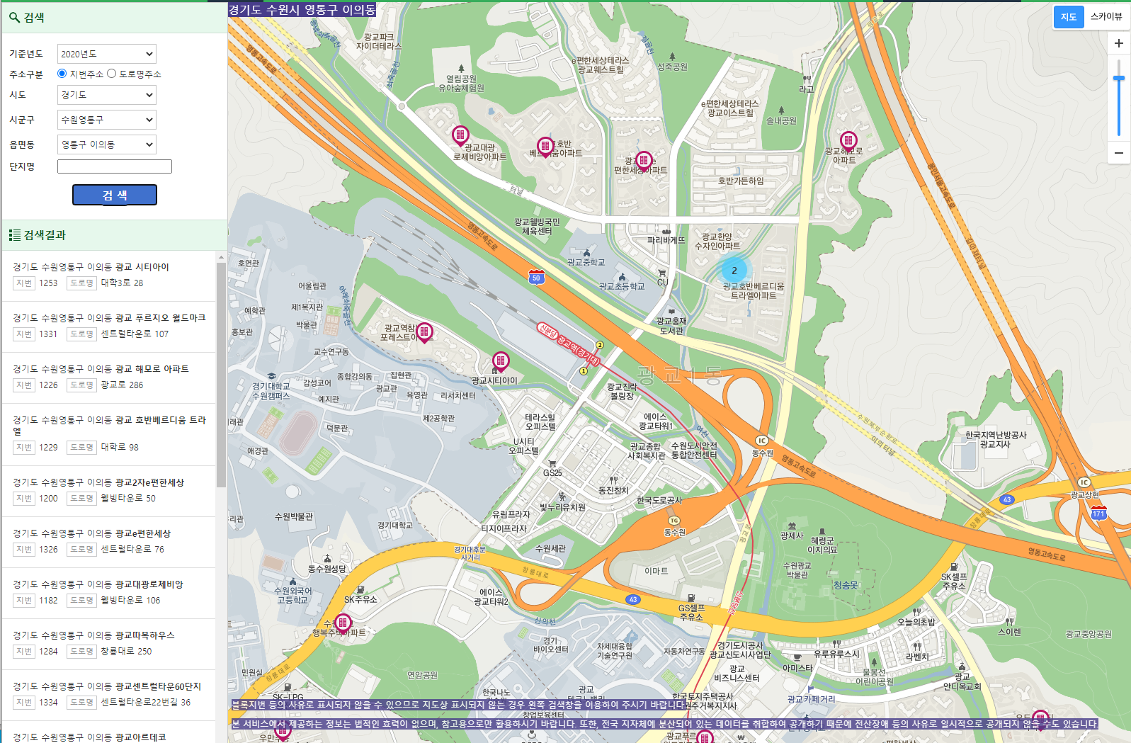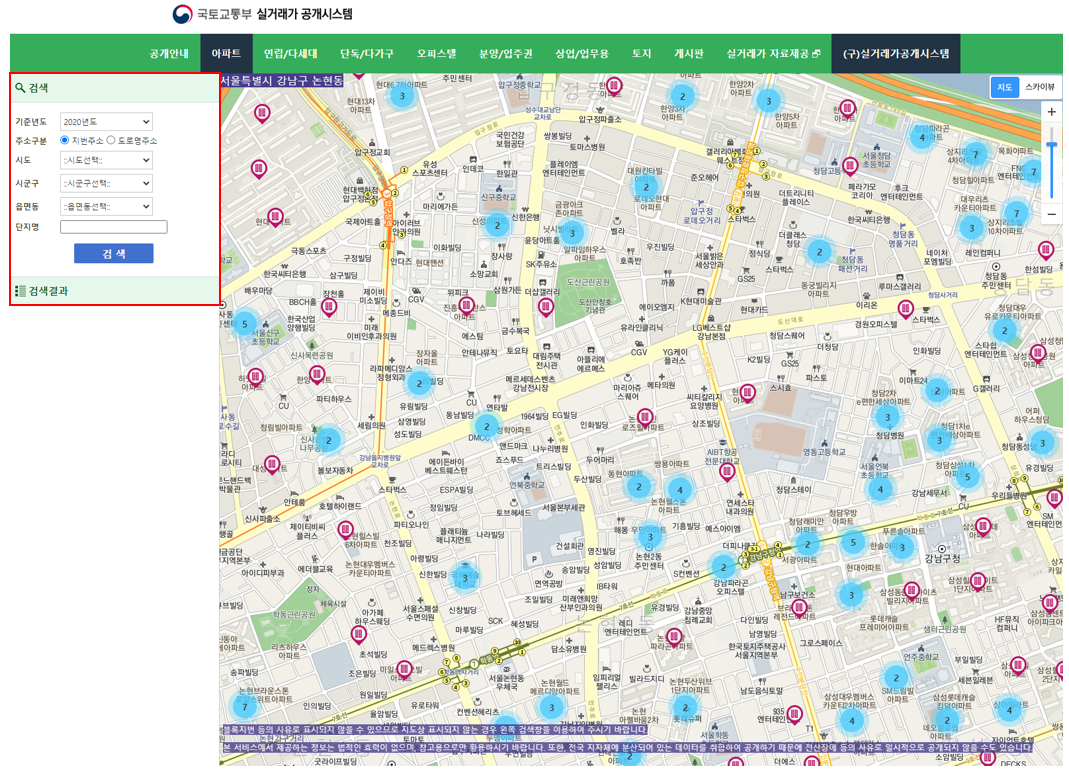 왼쪽 화면위에 검색란에 원하시는 아파트와 기준년도를 입력하면 아파트의 실거래 정보를 확인 하실 수 있습니다. 아파트 단지명을 모를경우 '동'까지만 입력을 하면, 지도에서 아파트 단지를 확인 할 수 있습니다.