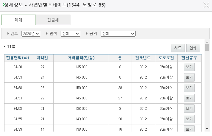 원하시는 단지를 클릭하면 아래와 같이 계약일과 실거래금액을 확인 하실 수 있습니다. (제가 관심있는 지역의 아파트를 확인해보긴 했는데, 부동산 가격이 정말 많이 오르긴 했네요....)