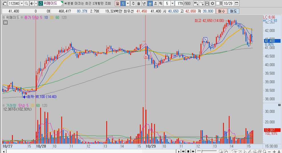 위메이는 게임관련주로 최근 2일간의 매수주체를 확인하고, 시가에 매수를 했습니다. 한번더 추가 매수 할 기회를 줫었는데, 체결은 되지 않고 그냥 가버렸습니다. 어제 종가부근까지 반등했을때 모두 정리했습니다.