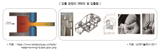 - (압출) 금속블럭을 고압 하에서 작은 다이 공(Hole)을 통하여 밀어냄으로서 단면을 수축시키는 공정이며, 이 공정은 주로 재료의 변형 저항이 작은 열간에서 행하여지고 봉이나 관의 생산에 주로 이용합니다.