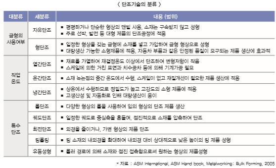 단조는 다양한 기준으로 구분할 수 있으나 주로 상온에서 이루어지거나(냉간단조), 고온에서 이루어지며(온간단조 혹은 열간단조), 일반적으로 추가적인 마무리 작업이 요구됨. 예를 들면 물성을 변화시키기 위한 열처리 또는 치수 정밀도와 표면 특성을 얻기 위한 기계 가공 등이 필요. 경우에 따라 정형가공(Net-Shape Forming) 혹은 준 정형가공(Near-Net Shape Forming)의 대표적인 예인 정밀단조(Precision Forging) 기술을 적용함으로써 마무리 작업을 최소화할 수 있습니다.