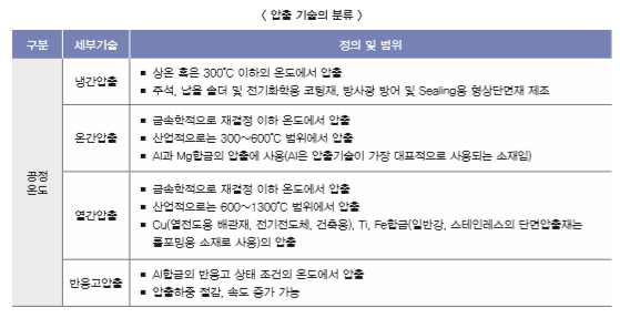 압출은 금속 빌렛을 노즐 형상의 금형 내로 통과시켜 봉·파이프·프로파일 형상의 제품을 연속적으로 생산하는 기술입니다. 인발(Drawing)도 압출처럼 금속이 금형을 통과하는 과정에서 단면형상을 변화시키는 소성가공기술입니다. 금형을 기준으로 소재의 입구 쪽에서 밀어서 성형하는 경우는 압출기술이며 소재의 출구방향에서 잡아당기는 힘을 이용하는 경우는 인발로 분류합니다.