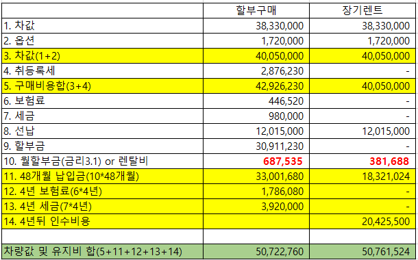 위의 표에서 보는 것 처럼 자동차 장기렌트를 이용해 자량을 구매 할 경우 일반 구매에 비해 자동차 장기렌트가 대략 4만원정도 더 필요한 것으로 확인이 됩니다. 다만, 위의 경우는 작년에 제가 차를 구매할때 작성한 비교표라 할부금리가 지금과 맞지 않습니다. 지금처럼 금리가 높은 상황에서는 아마도 일반구매가 자동차 장기렌트에 비해 더 많은 비용이 필요할 수도 있다고 생각됩니다.