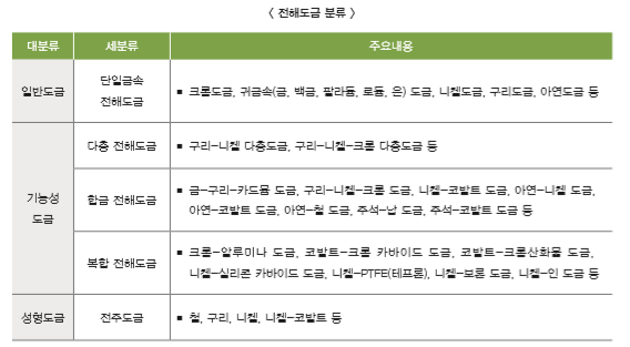 전해도금은 일반적으로 전류밀도가 높은 부분에 두꺼운 도금이 되고 낮은 전류밀도 부분에는 얇은 도금이 되며 도금층 구조, 조성 및 용도에 따라 일반도금, 기능성도금(다층, 합금, 복합 도금), 성형도금으로 분류됩니다.