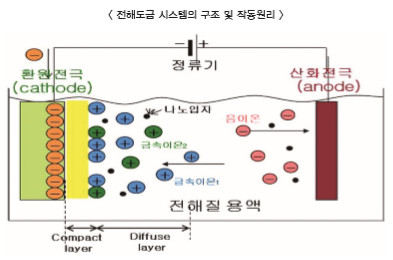 - 전해도금은 금속이온이 용해돼 있는 도금 용액 내에 시편(환원전극)과 양극(산화전극)을 침적시키고 전원(정류기)을 통해 일정 수준 이상의 과전위를 인가함으로써 시편 표면에 전기화학적 환원반응을 유발시켜 금속 및 비금속 코팅층을 형성하는 표면처리기술입니다.