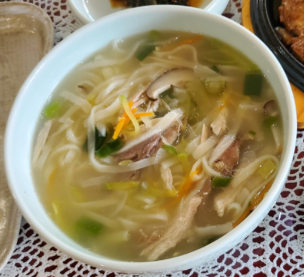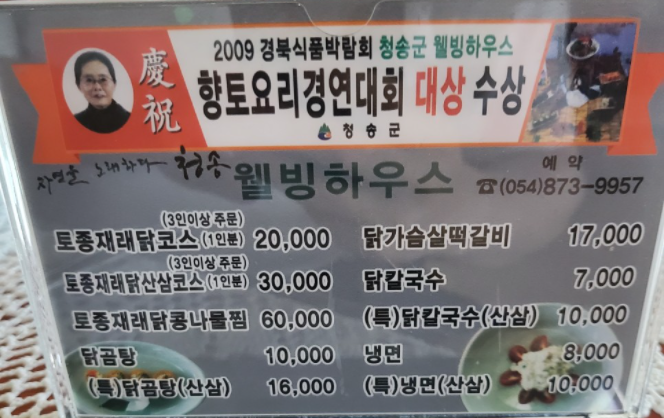 마지막 맛집은 닭칼국수와 닭곰탕을 파는 웰빙하우스 입니다. 이곳은 정말 강추하는 곳입니다. 처음에 방문할때 큰 기대를 하지 않고 방문했는데, 괜히 향토요리경연대회 대상을 수상한 집이 아니었습니다. 닭칼국수는 여러가지 재료들이 들어가서 국물도 진하고 맛있었습니다. 그리고 기본 찬으로 주는 묵은지가 정말 너무너무 맛있었습니다. 저희는 닭곰탕1개와 닭칼국수 2개를 시켜서 먹었습니다. 닭곰탕을 먹을 때는 닭 칼국수 육수랑 똑같겠지 하는 생각으로 먹었는데, 그렇지 않고 전혀 다른 맛이었습니다. 닭곰탕은 별다른 양념을 첨가하지 않아도 약간 칼칼한 맛이 났습니다. 닭곰탕역시 다양한 식재료들이 많이 들어가 있었고, 생각보다 저럼한 가격에 한번 놀라고, 안에 들어있는 다양한 식재료들에 한번 더 놀랐습니다. 청송에 가신다면 꼭 방문해서 드셔보시기 바랍니다.