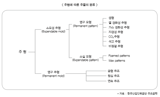 - 이와 같은 일련의 공정으로 얻어진 제품을 주물 또는 주조품이라고 하고, 주물을 제조하기 위하여 필요한 공정은 주물품의 설계, 주조 방안의 작성, 모형의 제작, 용해 및 주입, 후처리 순서로 진행됩니다.
