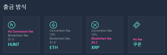 HUNT코인은 이더리움 블록체인 기반의 ERC20 토큰으로 헌프 틀랫폼 위의 다양한 서비스들의 보상 수단으로 사용된다고 합니다. HUNT코인을 사용해서 출금하는 경우, 환전 수수료는 무료이나 출금에 따른 네트워크 사용수수료로 건당 $1가 부과되게 됩니다. 이더리움의 경우 환전 수수료가 10%이고 네트워크 수수료가 $1이 지불되게 됩니다. XRP코인의 경우 환전 수수료가 10%, 네트워크 사용수수료가 $0.2입니다. 코인을 이용해 출금을 하는 경우는 HUNT코인을 이용해서 하는 것이 가장 유리한 방법인것 같습니다. 코인으로 출금하기 위해서는 전자지급을 소유하고 있어야 합니다. 전자지갑의 경우 코인거래소에 가입을 하면 자동으로 생성됩니다.