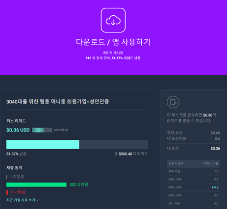 태스크에 참여하여 미션을 완료하게 되면 $0.36를 보상으로 받을 수 있습니다. 위 사진에 보면 신뢰도 점수가 있는데, 이것은 미션에 참여하는 사람의 신뢰도를 나타내는 것입니다. 미션을 성실하게 수행하면 할 수록 저 신뢰도 점수가 올라가고, 이로 인해서 보상을 받을때 보상비율을 1로 올라가게 됩니다. 저는 처음으로 참여를 했기떄문에 아직 신뢰도 점수가 40~59구간이라 리워드 비율이 0.6이고 이로 인해서 미션완료시 받을 수 있는 리워드는 $0.36입니다. 만약 제 신뢰도 점수가 80이상이라면 $0.6를 받을 수 있습니다. 따라서, 고가의 미션을 바로 수행하지 마시고, 비용이 작은 미션을 수행하고 신뢰도를 높여서 고가의 미션을 수행하면 좀더 많은 보상을 받을 수 있습니다. 고가의 미션들은 수행해야할 일들이 생각보다 많습니다.