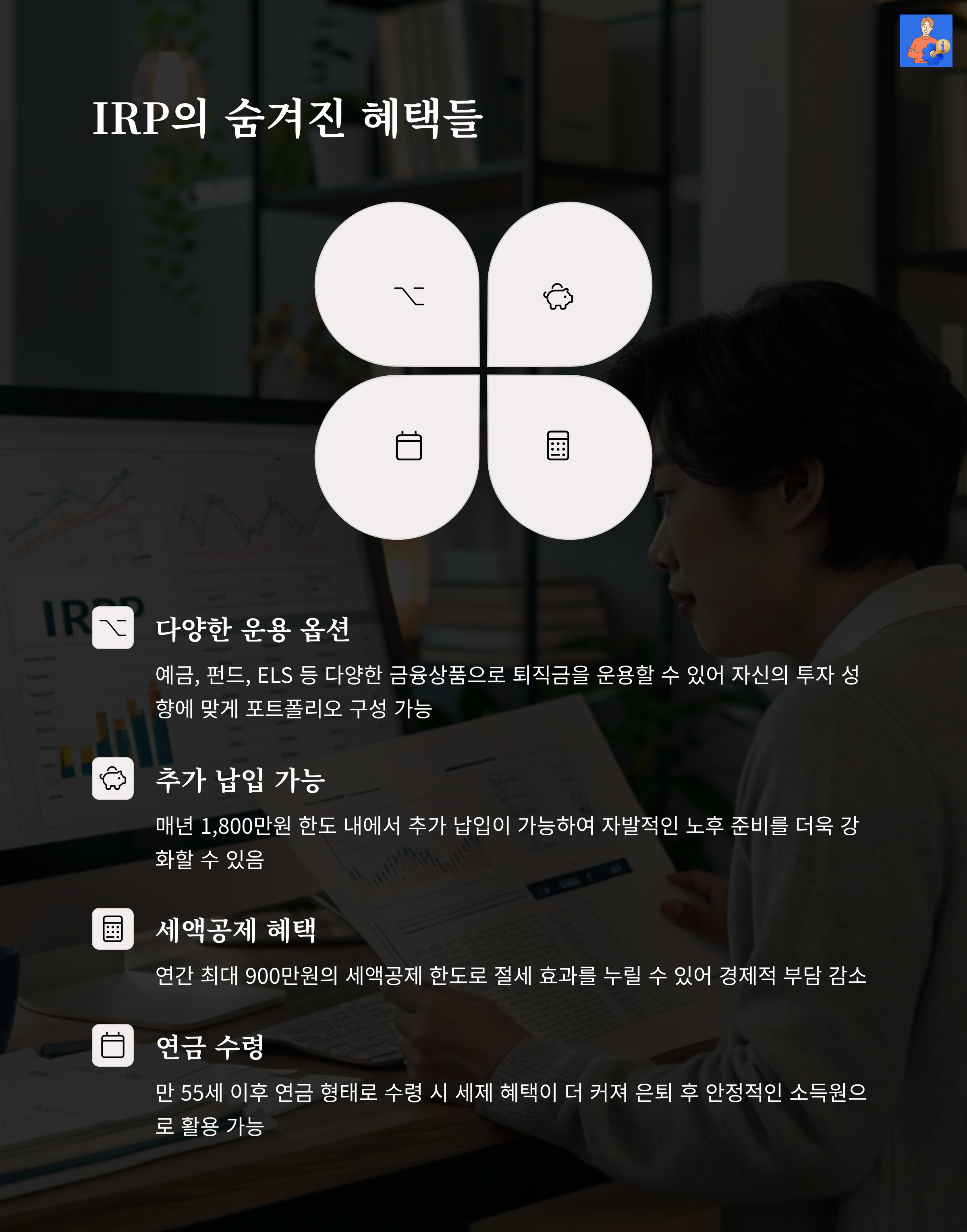 IRP는 개인 계좌로 퇴직금을 옮겨 투자 및 관리를 할 수 있어 수익률과 자산 운용의 자유도가 높습니다.
