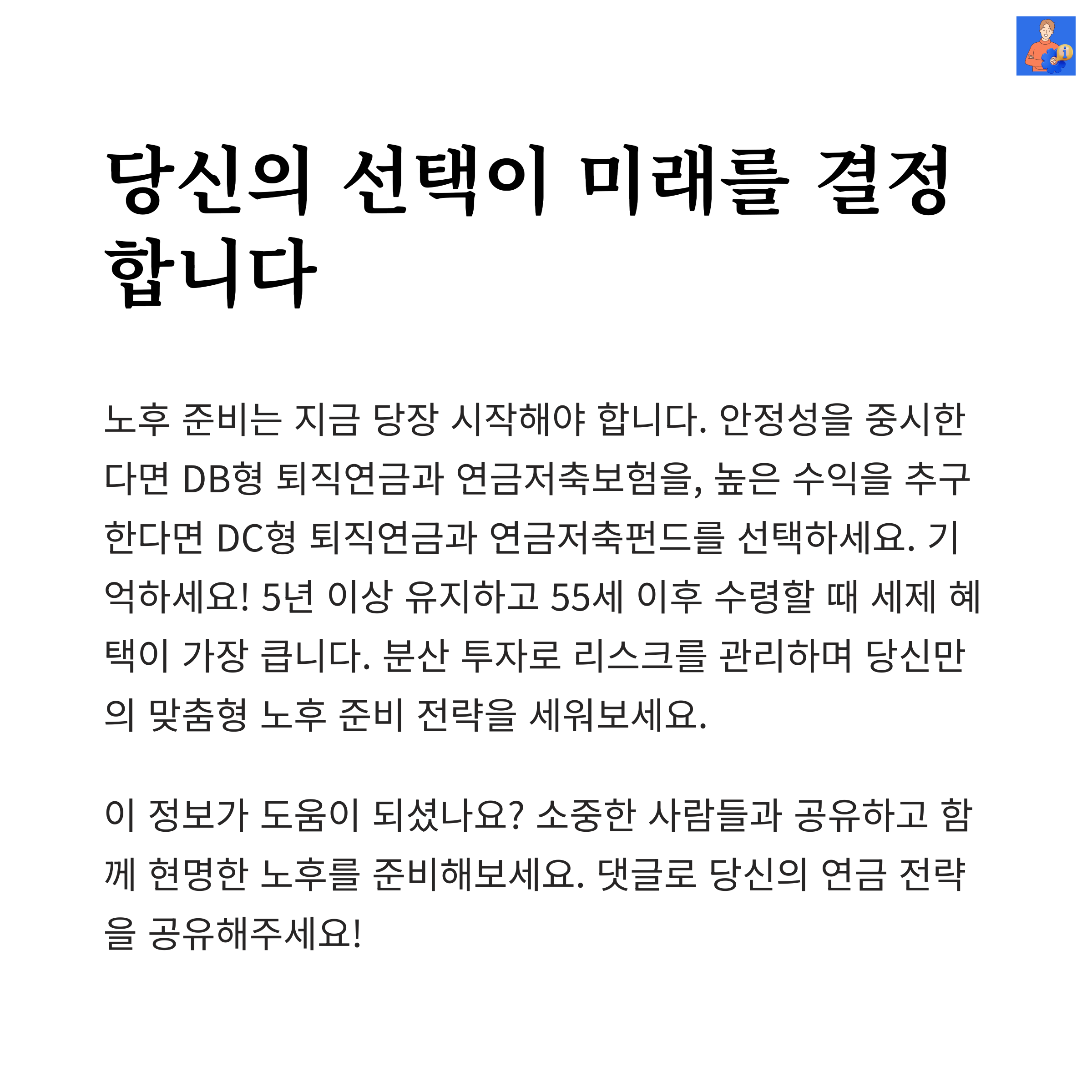 안정적인 노후 생활을 목표로 한다면 퇴직연금의 안정적인 지급 옵션을 선택하는 것이 중요합니다.