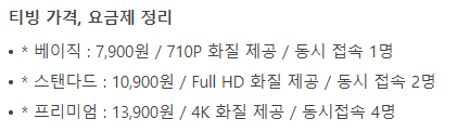 베이직은 Full HD화질이 아닌, 710P화질로 다시보기를 제공하고 동시접속 또한 불가능합니다. 스탠다드의 경우 10900원의 이용료를 내고 Full HD의 화질로 다시보기가 제공됩니다. 동시접속도 2명까지 가능하여, 내가 시청할 경우 다른사람 1명이 동시에 접속해서 다시보기를 감상할 수 있습니다. 가장 비싼 프리미엄 요금제의 경우 4K화질로 다시보기를 감상 할 수 있고, 동시접속또한 4명까지 가능합니다.