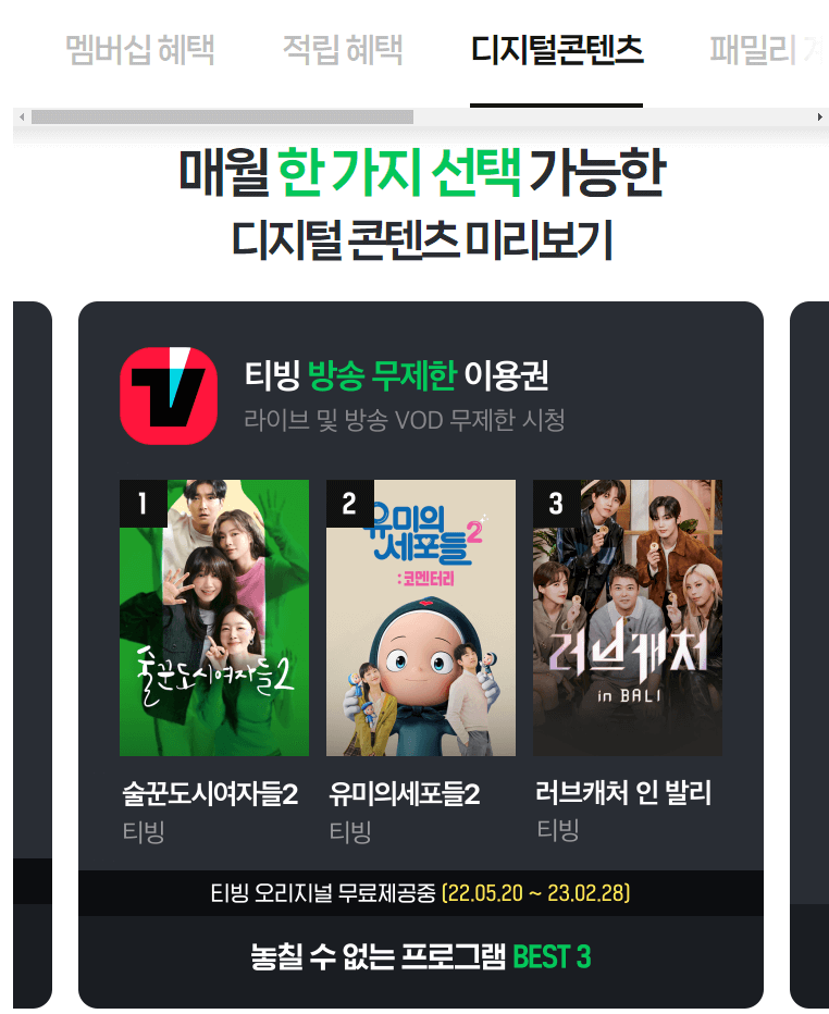 네이버멤버쉽을 이용하면, 티빙뿐만 아니라 다양한 디지털 컨텐츠를 사용할 수 있습니다. 사용가능한 디지털컨텐츠는 VIBE, SPOTV NOW, 웹툰, 시리즈온등이 있습니다. 또한, 네이버 MYBOX에 180GB의 용량을 제공해 주기 때문에 휴대폰의 사진 백업용이나, 나만의 웹하드로 사용하는등 다양하게 활용할 수 있습니다. 마지막으로, 가족중 1명이 네이버 멤버쉽을 이용하면 가족들 3명을 추가로 등록하여 사용할 수 있습니다.