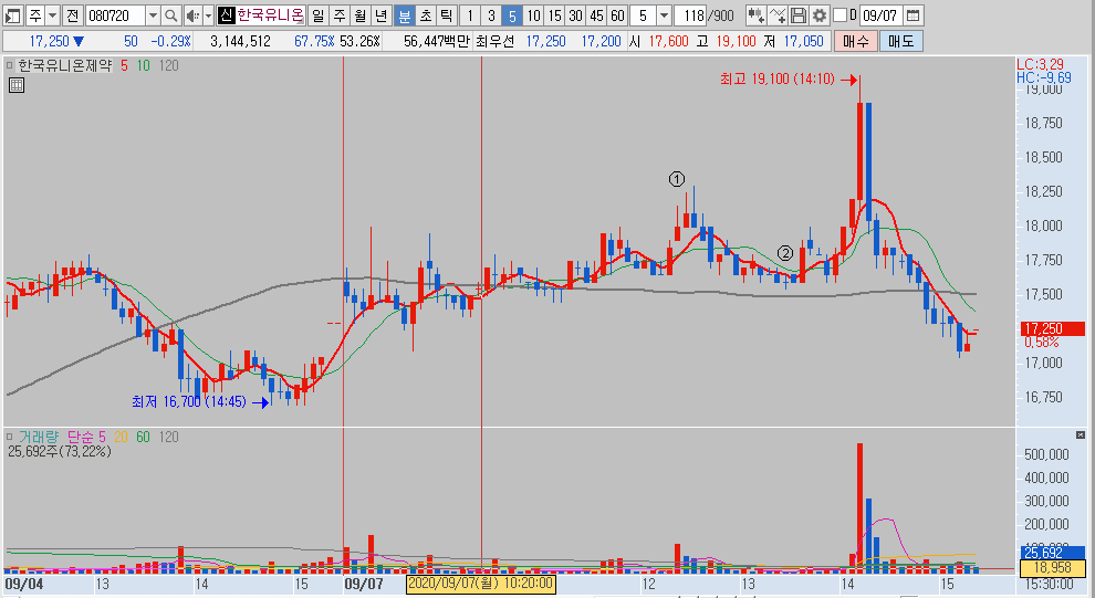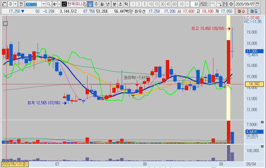 오늘은 금요일 미국시장의 하락에도 불구하고, 우리 시장은 많이 상승한 장이었습니다. 하지만, 외국인이나 기관에 의한 상승이 아닌 개인들의 폭풍 매수로 인한 상승이라 하루종일 불안했습니다. 지난 금요일에 D1종가베팅으로 들고온 한국유니온제약의 매도가 있었습니다. 한국유니온제약은 코로나19(덱사메타손)테마 상승 속 덱사메타손 성분 활용 약품 '유니덱사주'재생산 준비 소식에 9월3일 상한가에 진입했습니다. 금요일 저의 검색기에 검색되어 종가베팅을 하였습니다.
