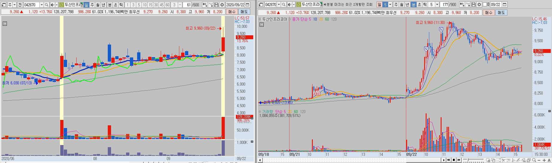 두산인프라코어는 10선 매매로 접근했습니다. 장마감 후 두산그룹에서 부채를 모두 부담해준다는 조건으로 재매각한다는 소식에 시간외에 상승을 했었으나, 나스닥의 급락으로 인해 크게 상승은 못했습니다. 장기간 횡보하면서 오늘 거래가 터지는 모습에 크게 갈거라 판단해서 10%이상에서 매도를 하려고 생각했습니다. 15프로 정도 상승했을때 보유한 주식의 절반정도 매도하고 보유중입니다. 매각일정이 일주일 뒤로 밀렸기때문에 일정이 살아있는 주식이라 생각하고 제가 생각했던 지지선만 지켜준다면 남은 수량은 몇일간 더 보유할 생각입니다.
