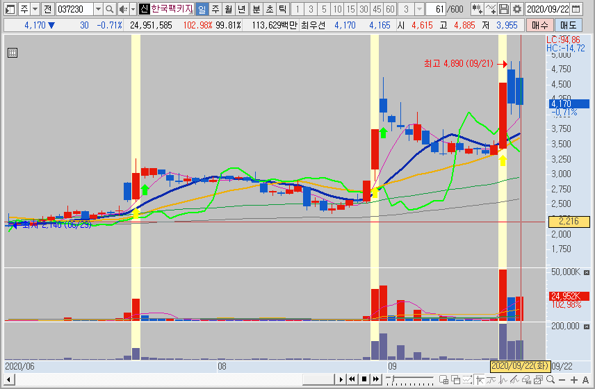 한국팩키지는 코로나발 플라스틱 대란 시작으로 친환경 종이용기 수요급증으로 인해 전일 상한가를 갔었습니다. 언택트 관련해서 음식을 배달해서 먹는 사람들이 증가하고 이것으로 인해 새로운 코로나관련 테마군이 형성된것 같습니다. 급등주 검색기에 검색이 되어 전일 종가베팅을 하였고, 오늘 시가부터 매우 강한 모습에 좋은 수익으로 마감할 수 있었습니다.