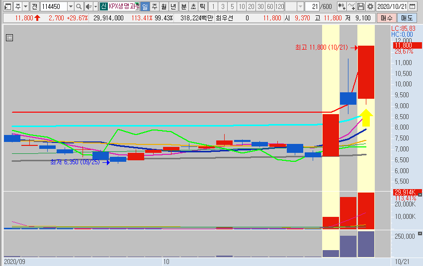 KPX생명과학은 미국 화이자 관련주로 백신 긴급승인으로 인해 급등했습니다. 어제 윗꼬리가 크게 달리면서 음봉이 만들어졌습니다. 그런데 오늘 아침에 갭이 떠줘서 어제는 개미들 털려고 했구나 하는 생각에 매매에 임했습니다. 보통 이렇게 봉이 만들어질 경우 상한가를 가는 경우가 많은데, 믿음이 부족해서 인지 크게 먹지는 못했습니다. 상따를 하려고 했는데 차마 손이 가지는 않아서 그냥 보내줬습니다.