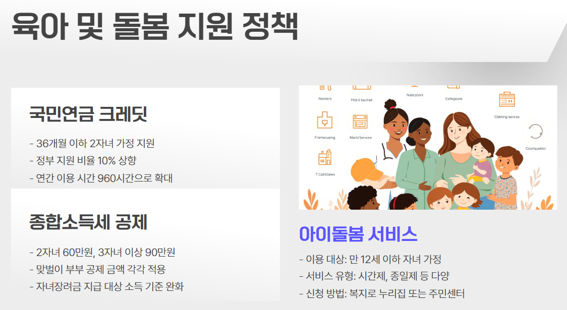 국민 연금 가입 기간을 추가 인정받는 제도로, 둘째 아이부터 혜택이 적용됩니다. 최대 50개월까지 늘어날 수 있어 나중에 연금을 받을 때 꽤 도움이 되겠죠. 아이가 많을 수록 크레딧 폭이 커지니, 놓치면 아까운 다자녀 혜택 중 하나 입니다.