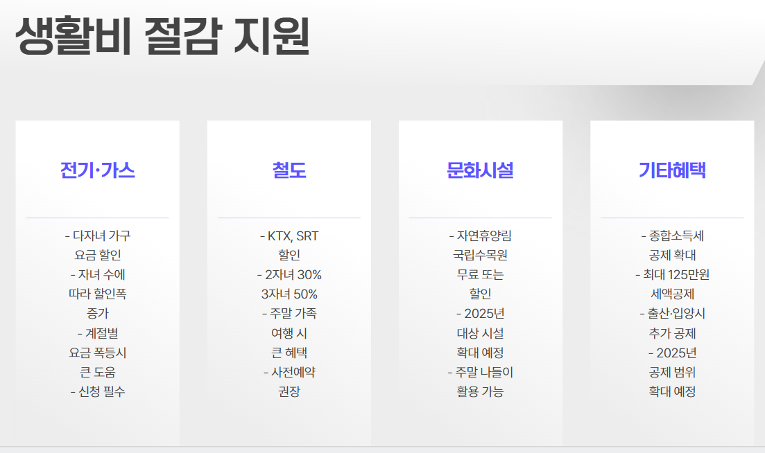 아이들을 키우는 입장에서 2024년과 달리 2025년에는 다자녀 가구 혜택이 어떻게 바뀌고 확대되는지 알아보았습니다. 특히 요즘 부쩍 많은 분들이 다자녀 혜택에 관심을 갖고 있던데, 저 역시 자녀가 여러 명이라 교육비, 생활비등 부담이 만만치 않아 정부와 지자체에서 마련한 다양한 지원 제도들을 미리 파악해두면 좋을 것 같습니다.