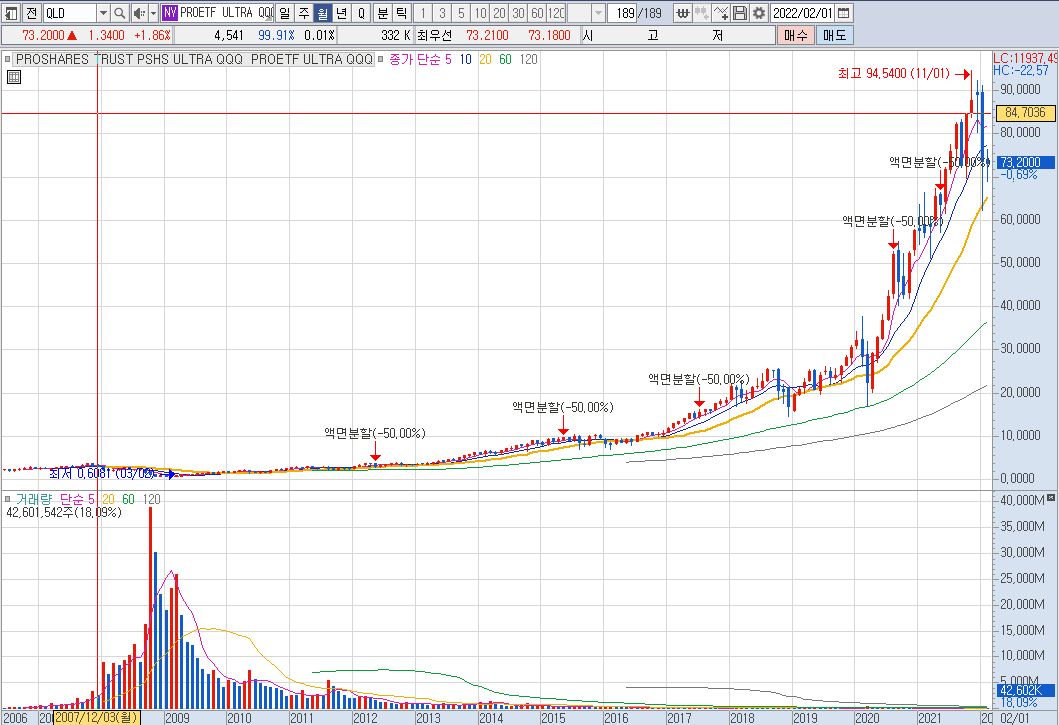 2006년에 처음 상장되어 중간에 액면분할을 몇번했지만, 최저가 0.61달러였던 QLD는 현재 73달러에 거래되고 있습니다. 대략 15년동안 120배의 상승을 보여주고 있습니다. 처음 시작하는 시기에 약100달러를 투자했다면 현재 12000달러가 되어있다는 뜻이 됩니다.