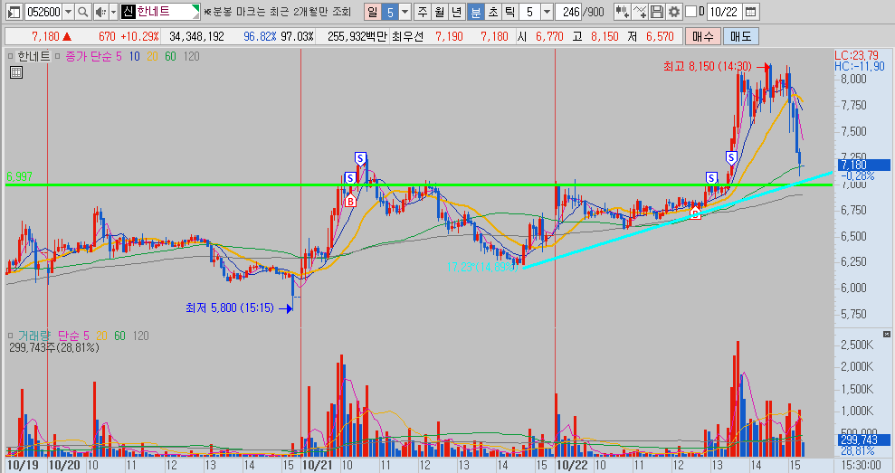 어제 매매일지에서 한네트가 고점을 넘어서면 좋은 모습을 보여줄 수도 있다고 말씀드렸었습니다. 금일 시가갭을 뜨면서 오전에 치고 나가는 모습을 보여줬습니다. 그런데 어제의 고점을 넘지 못하고 눌리길래 오늘도 그냥 그런가보다 하는 생가이었는데, 오후장에 들어가면서 저점을 점점 높여가면서 거래량이 늘어나는 모습에 1차와 2차 저항에서 매도했는데, 이게 발매도였네요... 매도하고서 얼마가 날라가는건지. 일을 해야 해서 적당히 정리했더니 저렇게 가버렸네요.. 10월21일 포스팅을 보신분들도 진입을 했었으면 좋겠네요..^^