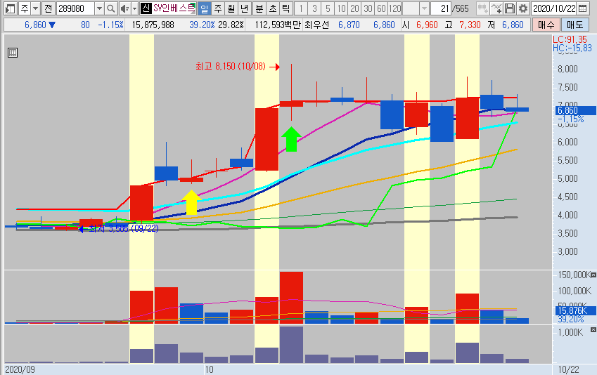 이뮨메드 관련 이슈로 상한가에 진입했었습니다. 상한가 이후 지속적으로 횡보구간을 거치다가 그저께 거래량을 동반한 장대양봉이 생기면서 좋은 모습을 보여줬습니다. 최고종가로 마무리하면서 어제 조정을 주는 좋은 모습을 보았습니다. 게다가 검색기에 검색이 되면서 종가베팅을 했습니다. 금일 지수의 영향이었던건지 목표했던 가격 코앞에서 무너지는 모습에 수익률이 저조하네요.