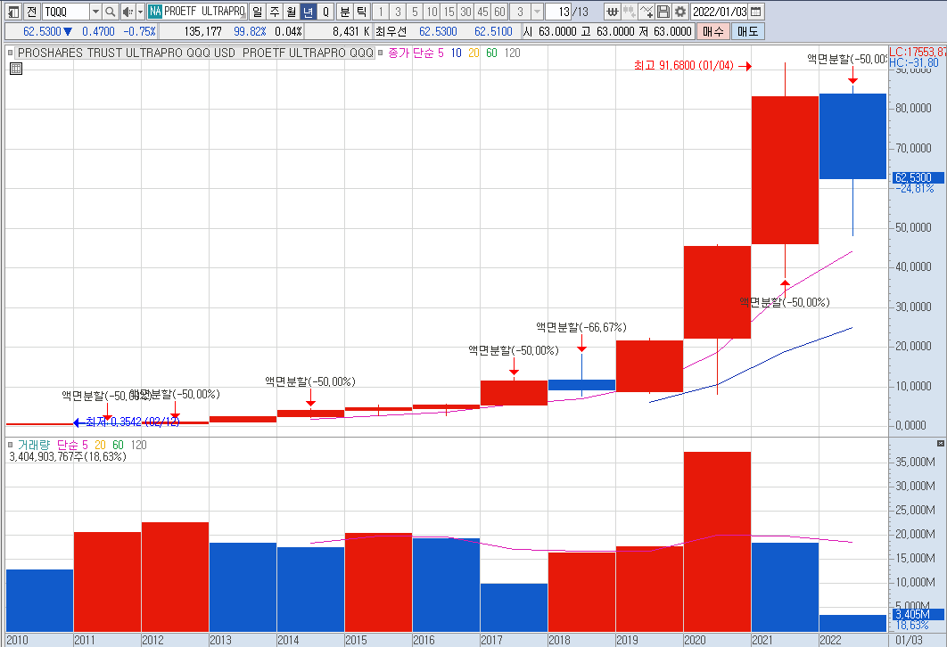 아래 차트에 보듯이 삼성전자 2010년 최저가 14500원에서 2021년 최고가 96800원 대략 6.5배 정도 상승을 했습니다. 반면 TQQQ는 2010년 최저가 0.35달러에서 2021년 최고가 91.6달러로 260배가 오를 것을 볼 수 있습니다.