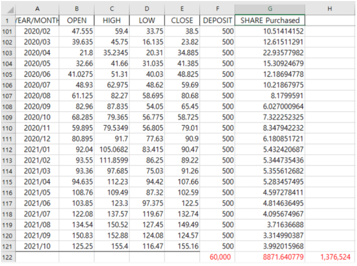 계산하기 편하게 매달 500달러씩 매수했다고 가정하고 백테스트를 진행한결과 원금은 60000달러이지만, 현재의 가격은 130만달러로 불어난것을 볼 수 있습니다. 제가 매달 20만원씩 저축을 해줬으니, 대략 위의 도표처럼 적립했으면 130달러의 1/3이라고 단순계산해도 5억이 넘는 원금을 알 수 있습니다. 5억 vs 2500만원... 비교도 되지 않는 수익률인것을 알 수 있습니다.