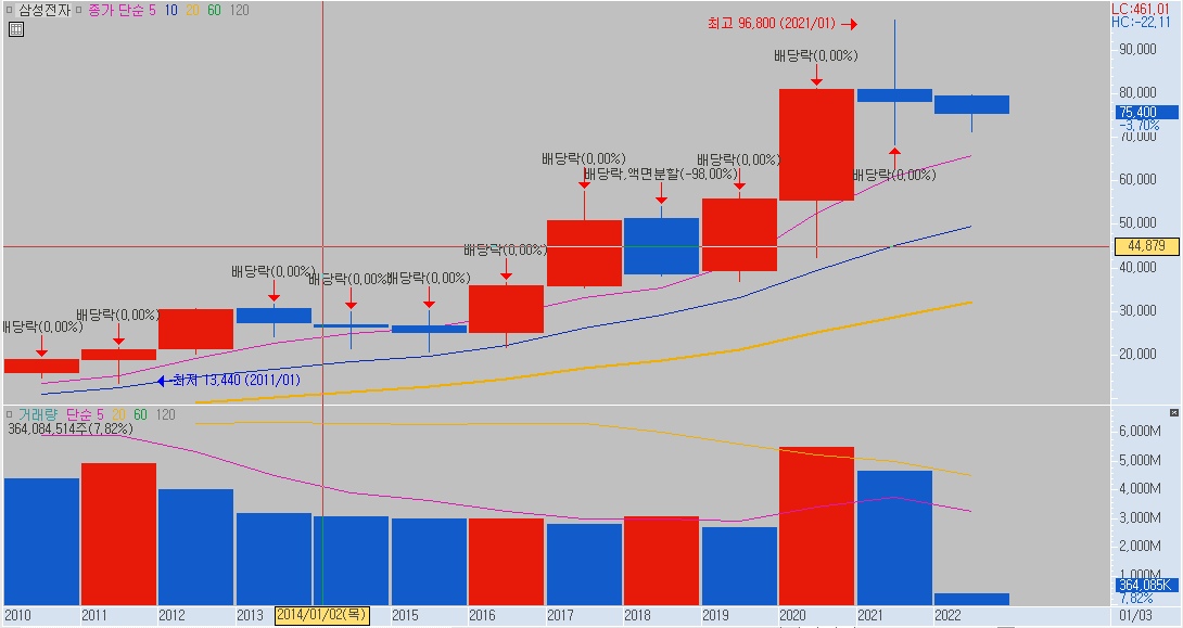 아래 차트에 보듯이 삼성전자 2010년 최저가 14500원에서 2021년 최고가 96800원 대략 6.5배 정도 상승을 했습니다. 반면 TQQQ는 2010년 최저가 0.35달러에서 2021년 최고가 91.6달러로 260배가 오를 것을 볼 수 있습니다.