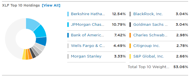 XLF가 투자하고 있는 섹터들은 아래 표와 같습니다. 전통적인 금융업종들이 대거 포진해 있는 것을 볼 수 있습니다.